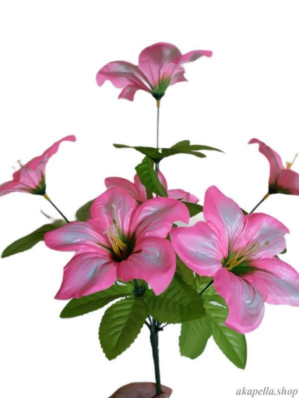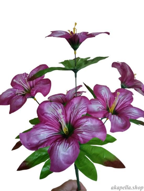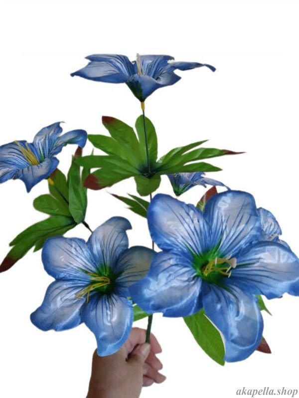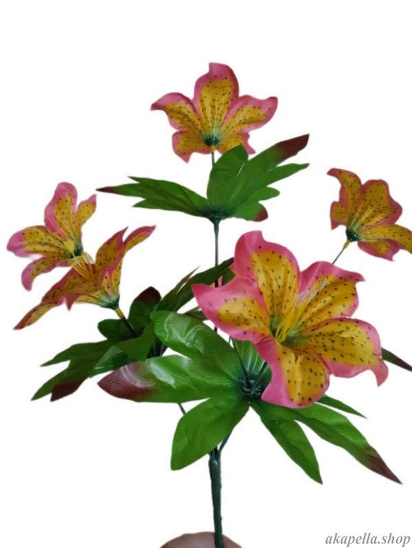 Букет "Лілія" чотири кольори (тканина атлас, пресована, оброблена, d квітки -11 см, h квітки - 3 см, h букету (з квіткою) - 35 см (включно з 7 см тримачем знизу). Лілія тигрова йде менша за розміром - d квітки -10 см (квітка на фоні інших лілій здається трохи меншою). Основне призначення букетів - поминальні, обрядові, для кладовища.