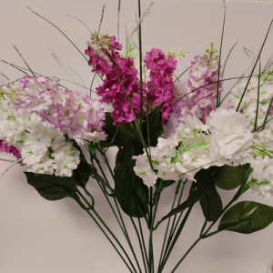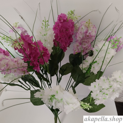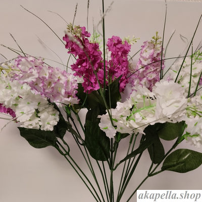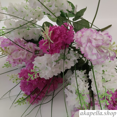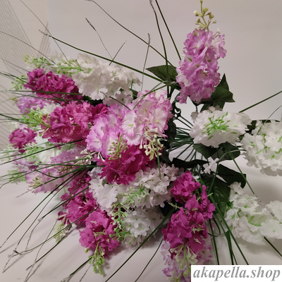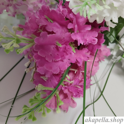 Букет "Бузок" (16 гілочок) з трав'яною добавкою. Сатин оброблений, на дотик тканина напівм'яка, висота букету (з квіткою) - 42 см (включно з 11 см тримачем знизу). Якість дрібного цвіту десь на 5 з 10 балів. Призначення букета - тільки обрядові.